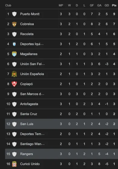Tras tres fechas disputadas, San Luis ahora está 12° con solo dos unidades. Mientras que Rangers sale del fondo de la tabla con un punto y con diferencia de gol -4. El colista absoluto es Curicó que tiene -5. Rangers ahora tiene el clásico de visitante ante Curicó Unido el próximo 15 de marzo. Por su parte, el cuadro de Humberto Suazo será local el sábado 14/3 frente a Deportes Copiapó.