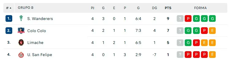 Por su parte, Limache sube al tercer lugar con cinco unidades, y provoca que el duelo que se jugará el fin de semana del 5 de abril entre Colo Colo y Wanderers en el Estadio Monumental sea clave para el futuro del Cacique en la Copa Chile, pues está obligada a ganar y definir en la última fecha con los “tomatinos”.
