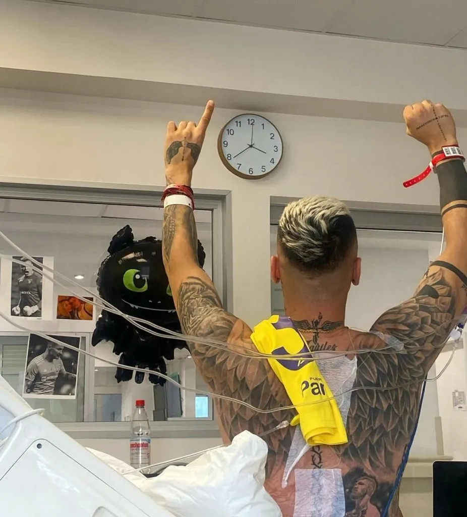 Fueron dos las imágenes que subió el jugador en la red social. La primera de ellas lo muestra de espaldas, con parches y tubos que dan cuenta de su actual estado, en la cama del hospital y con la camiseta del SAU, donde aparece con su mano izquierda que apunta su dedo índice al cielo, y la derecha con un puño cerrado.