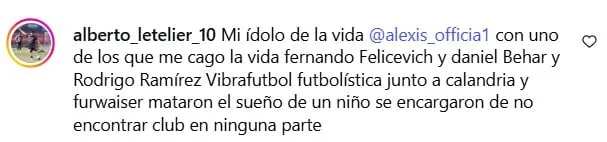 “Mí ídolo de la vida con uno que me cag… la vida, Fernando Felicevich… Mataron el sueño de un niño, se encargaron de no encontrar club en ninguna parte”, escribió el oriundo de Machalí en la cuenta de Alexis Sánchez.