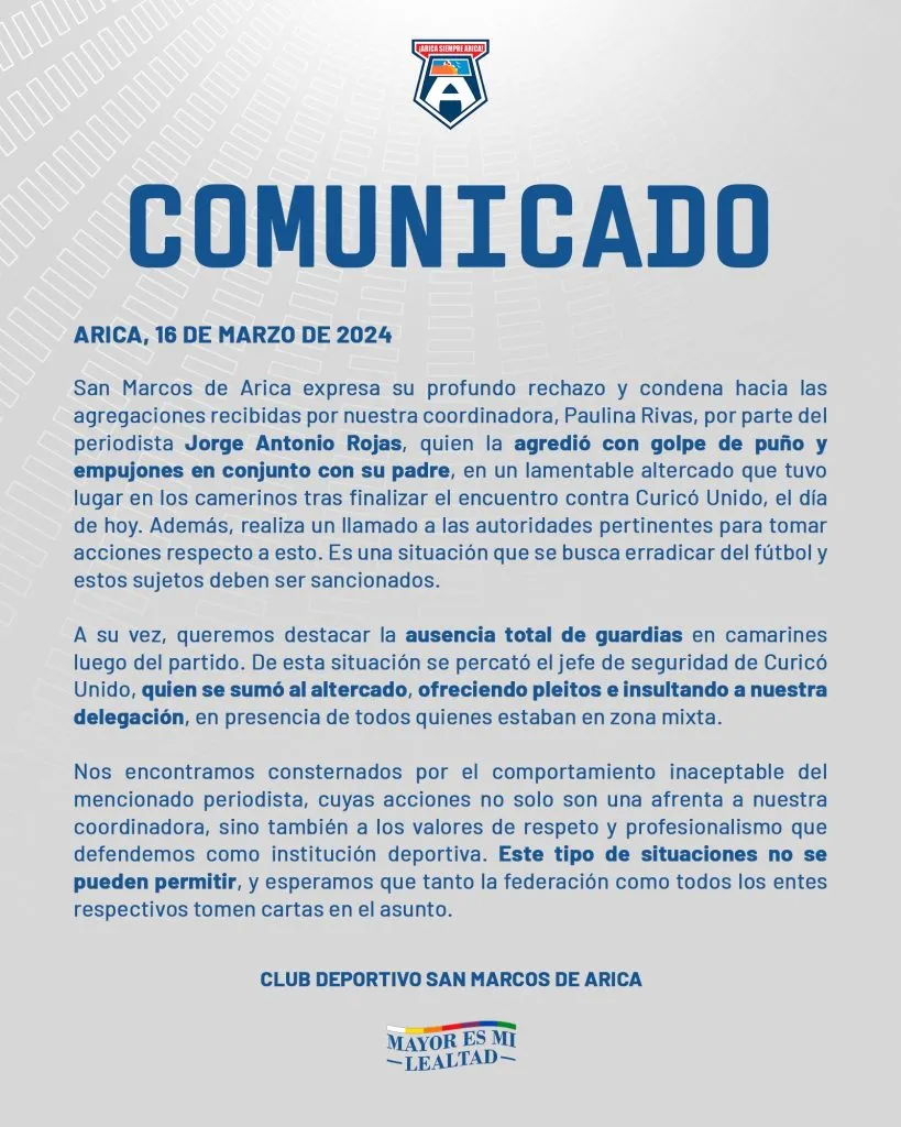“San Marcos de Arica expresa su profundo rechazo y condena hacia las agregaciones recibidas por nuestra coordinadora por parte del periodista Jorge Antonio Rojas, quien la agredió con golpes de puño y empujones en conjunto con su padre“, indica la institución.