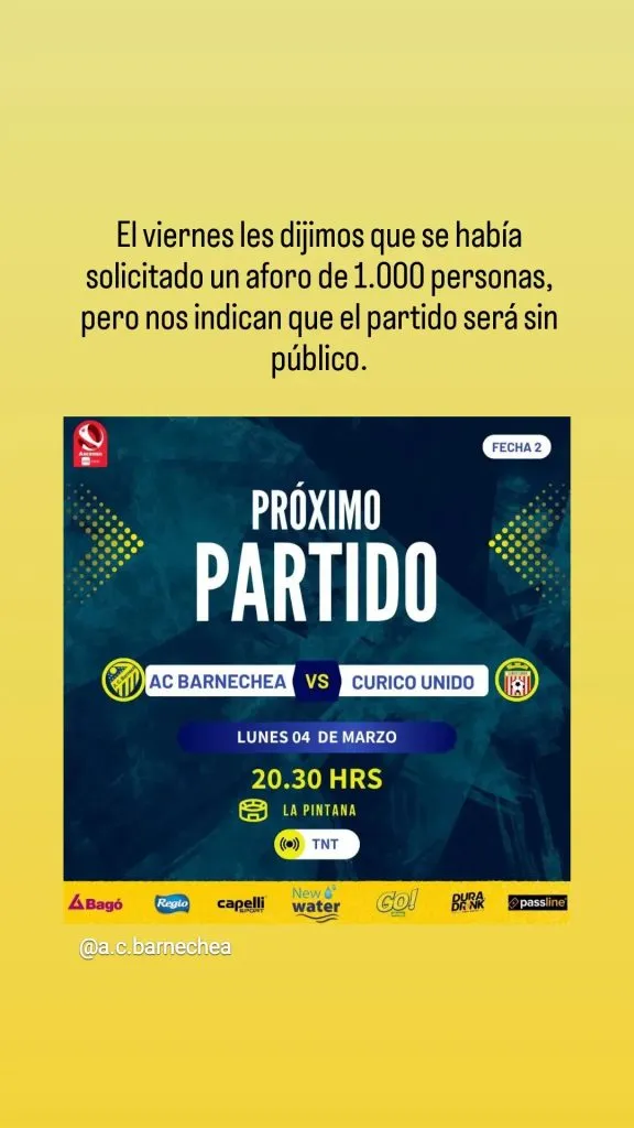 Una decisión que sorprendió a Barnechea, quien a través de su cuenta oficial de Instagram se limitó a decir que “el viernes dijimos que se había solicitado un aforo de mil personas, pero nos indican que el partido será sin público“, algo que también pilló sobre la marcha a Curicó.