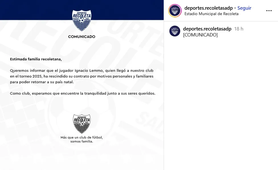 A través de un comunicado, el club señaló en sus redes sociales que motivos personales del deportista estaría detrás de la decisión. “Queremos informar que el jugador Ignacio Lemmo, quien llegó en el torneo 2025, ha rescindido su contrato por motivos personales y familiares para poder retornar a su país natal”.
