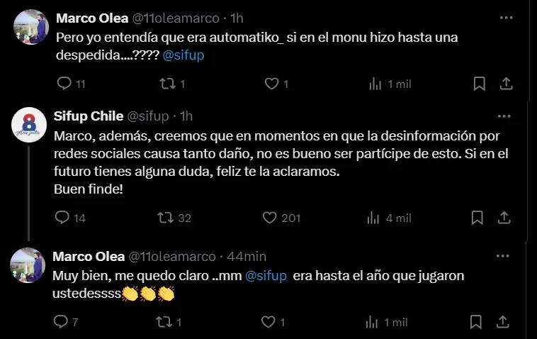 “Muy bien, me quedó claro… mmm Sifup era hasta el año que jugaron ustedes”, sentenció Olea junto a tres emojis de aplausos.