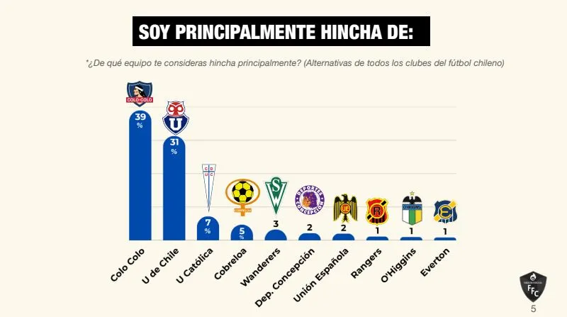De un total de 7.667 casos en el primer sondeo, el club más popular en el país fue Colo Colo, 39% de preferencias bajo la pregunta “¿De qué equipo te consideras hincha? Lo siguen U de Chile, con 31% y tercero U Católica, con 7%.