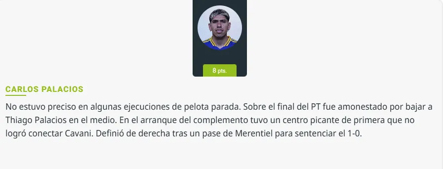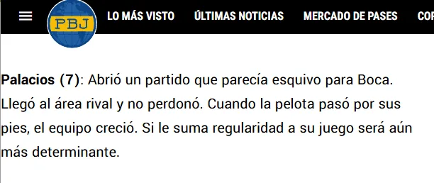 Por otro lado, el portal partidario Planeta Boca Juniors le dio nota 7, donde resaltaron que “si le suma regularidad a su juego será aún más determinante“, y que “cuando la pelota pasó por sus pies, el equipo creció”.