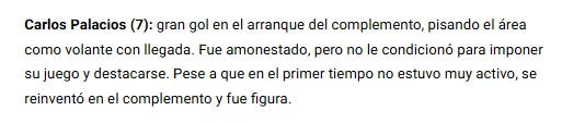 En tanto, la transmisión oficial de ESPN en Argentina lo eligió como una de las figuras del compromiso ante Estudiantes de La Plata. En la entrevista post partido, Carlos Palacios aseguró que “fue un primer tiempo complicado para nosotros. No encontrábamos espacios, pero el segundo tiempo creo que salimos a jugar de otra manera y creo que quedó demostrado en el resultado“.