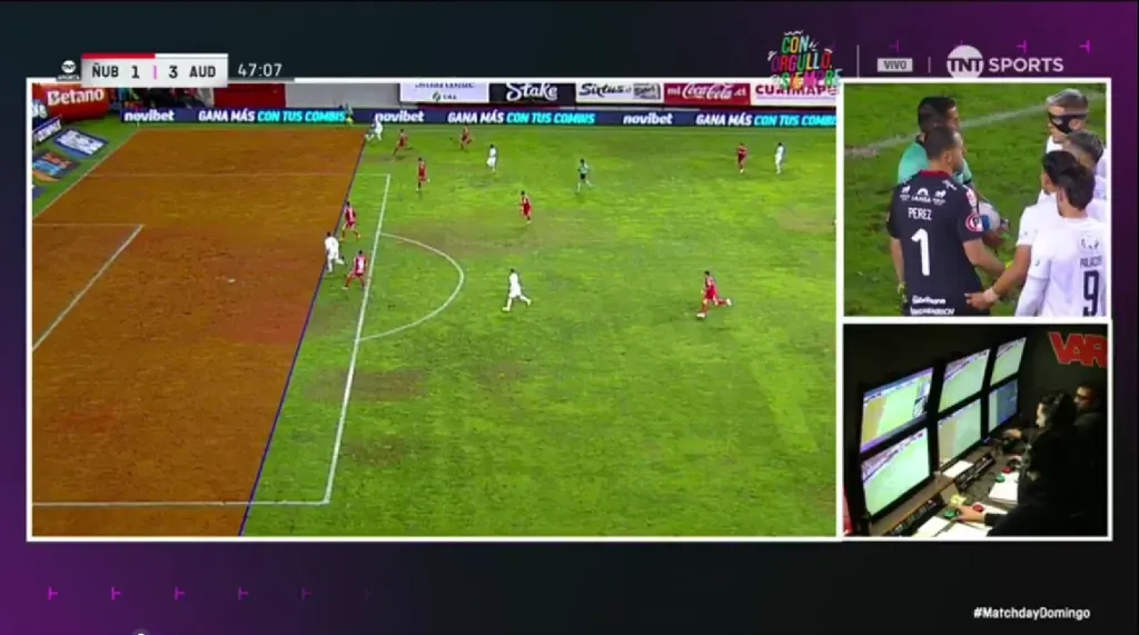 El VAR revisó la situación y hasta ahí todo iba medianamente bien. Pero empezó a ir medianamente mal porque trajo un increíble error técnico: La línea del offside se trazó detrás del balón.