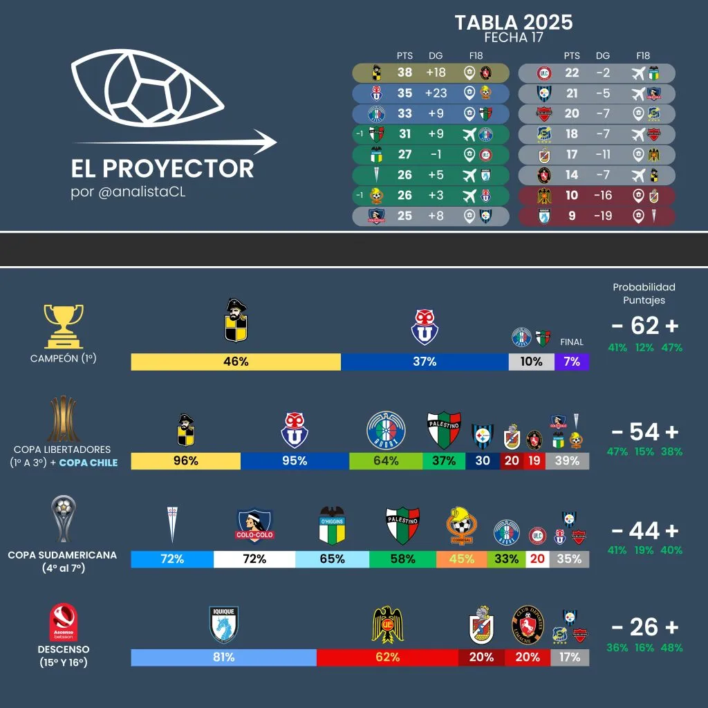 El Proyector, en base a miles de datos combinados, dio a conocer cómo terminaría la Liga de Primera. Ahí, en la estrecha lucha por el título, Coquimbo Unido sacaría ventaja sobre U de Chile para ser campeón.