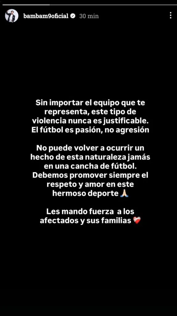 “Sin importar el equipo que te representa, este tipo de violencia nunca es justificable. El fútbol es pasión, no agresión. No puede volver a ocurrir un hecho de esta naturaleza jamás en una cancha de fútbol“, partió diciendo Bam Bam.