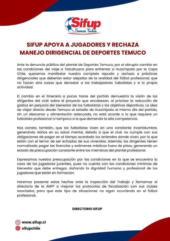 “Dispondremos de todos los antecedentes a la Dirección del Trabajo de las irregularidades que existen en Deportes Temuco y le solicitamos al directorio de la ANFP que deje de mirar para el lado en las malas prácticas que incurren sus clubes asociados”, destacaron.