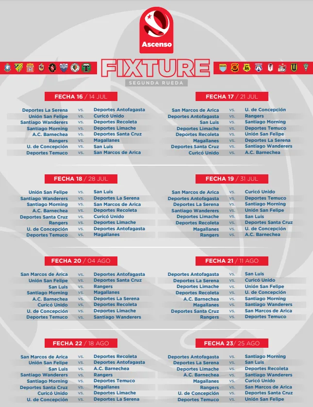 Tras un parón de un poco más de un mes, la segunda rueda del ascenso comenzará el fin de semana del 14 de julio. De ahí en más las cosas se jugarán hasta el 20 de octubre, día para el que está agendada la última fecha. Esto, con mucho por jugar aún en el fútbol chileno.