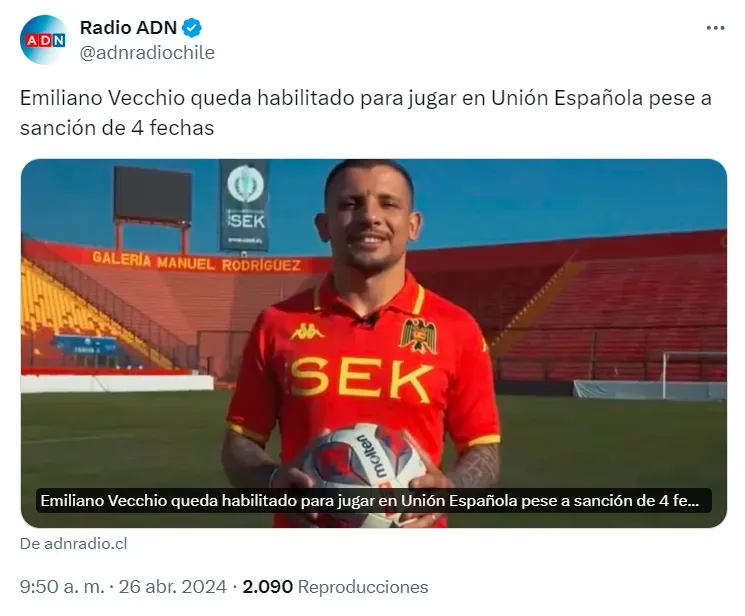 Una polémica no menor trajo la suspensión de Emiliano Vecchio, volante de Unión Española, por cuatro partidos según decidió el Tribunal de Disciplina de la ANFP, tras los insultos que profirió contra el árbitro Diego Flores en el duelo ante Universidad de Chile.