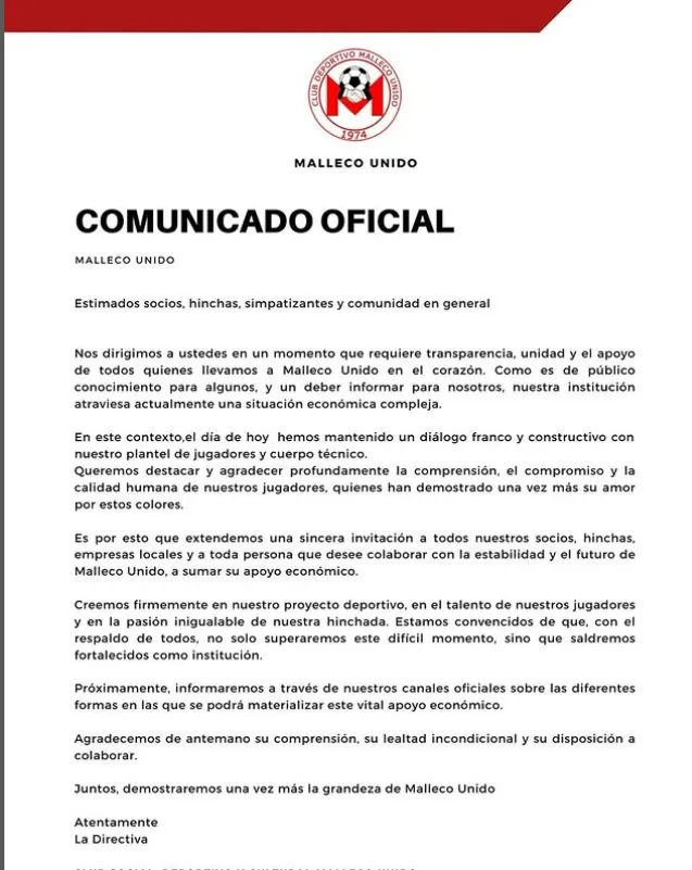 En el comunicado señalan: “Extendemos una sincera invitación a todos nuestros socios, hinchas, empresas locales y a toda persona que desee colaborar con la estabilidad y el futuro de Malleco Unido, a sumar su apoyo económico”.
