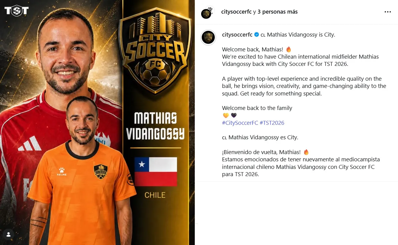 El jugador fue presentado en City Soccer como un nuevo refuerzo, equipo que también oficializó la llegada de Nicolás Castillo. “¡Bienvenido de vuelta, Mathias! Estamos emocionados de tener nuevamente al mediocampista internacional chileno Mathias Vidangossy con City Soccer FC para TST 2026”.