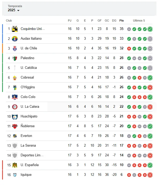 Así las cosas, y luego del triunfo de Everton por 4-1 ante Huachipato, así queda la tabla de posiciones de la Liga de Primera 2025.