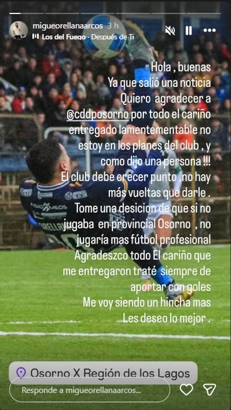 Una inesperada noticia entregó el jugador Miguel Ángel Orellana, quien a través de sus redes sociales confirmó que no seguiría el Provincial Osorno por decisión de la dirigencia, pero además, tras este duro panorama decidió colgar los botines.