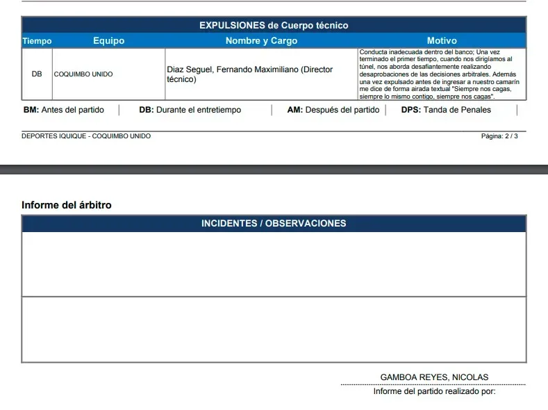 Según reporta Gamboa, el estratega tuvo una “conducta inadecuada dentro del banco“, para luego detallar que “una vez terminado el primer tiempo, cuando nos dirigíamos al túnel, nos aborda desafiantemente realizando desaprobaciones de las decisiones arbitrales”, por lo que recibe la tarjeta roja.