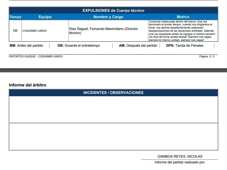 “Además, una vez expulsado antes de ingresar a nuestro camarín me dice de forma airada textual ‘Siempre nos cagas, siempre lo mismo contigo, siempre nos cagas’“, complementa Nicolás Gamboa sobre los insultos de Fernando Díaz.