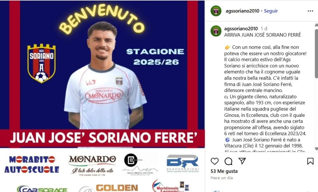 El equipo que disputa la quinta división en Italia reveló la noticia en sus redes sociales. “¡Con un nombre así, al final solo pudo ser uno de nuestros jugadores! El mercado de fútbol de verano de Ags Soriano se está haciendo más rico con un nuevo elemento que tiene el mismo apellido que nuestra hermosa realidad”.