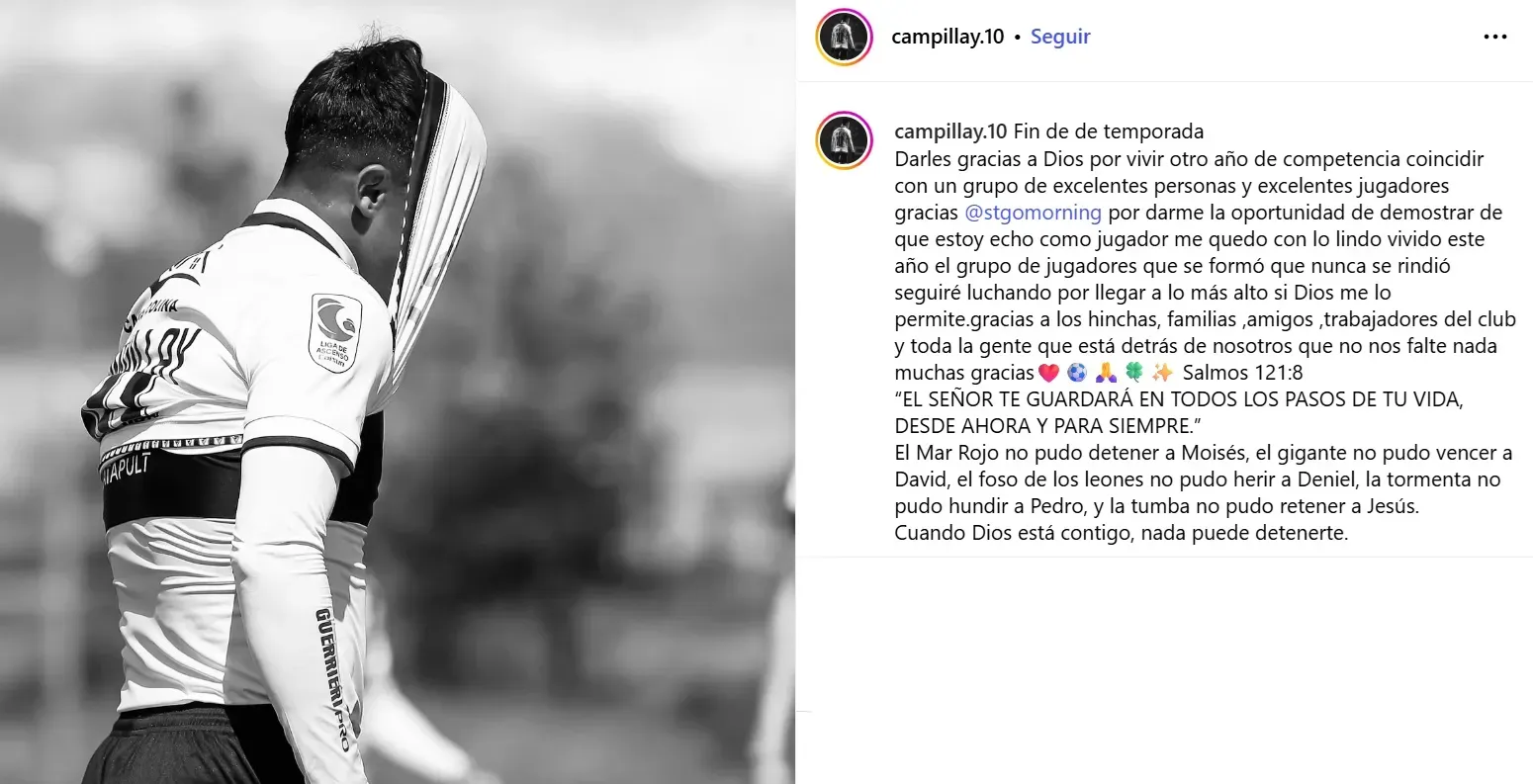 Debido a esto, el jugador confirmó a través de sus redes que deja el equipo. “Querido Santiago Morning, primero que todo agradecer este tercer año junto a ustedes cumpliendo 90 partidos, a cada funcionario que siempre me trató de una manera impecable como también a mi familia”.
