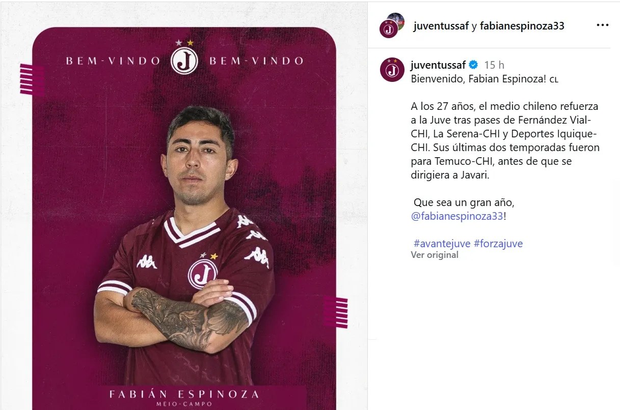 El club, que disputa el Campeonato Paulista Serie A2, compartió un mensaje anunciando su fichaje, donde señalan que el jugador es uno de los grandes refuerzos para la próxima temporada: “Que sea un gran año”. Por su parte, Espinoza escribió: “Nuevos desafíos”.