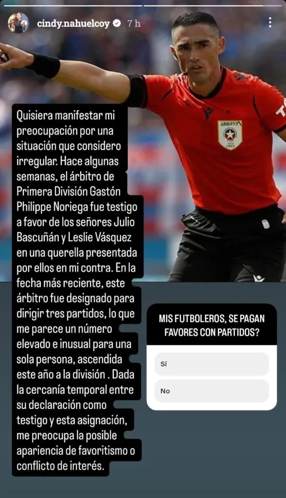 “Es una situación que considero irregular. Hace algunas semanas, el árbitro de Primera División Gastón Philippe Noriega fue testigo a favor de los señores Julios Bascuñán y Leslie Vásquez en una querella presentada por ellos en mi contra”, partió diciendo Nahuelcoy.