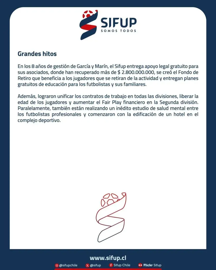 De acuerdo a lo que informa la organización, durante el mandato de Gamadiel García se logró “recuperar más de $2.800 millones de pesos, además de la creación del Fondo de Retiro, y la entrega de planes gratuitos de educación para los jugadores y sus familias”.