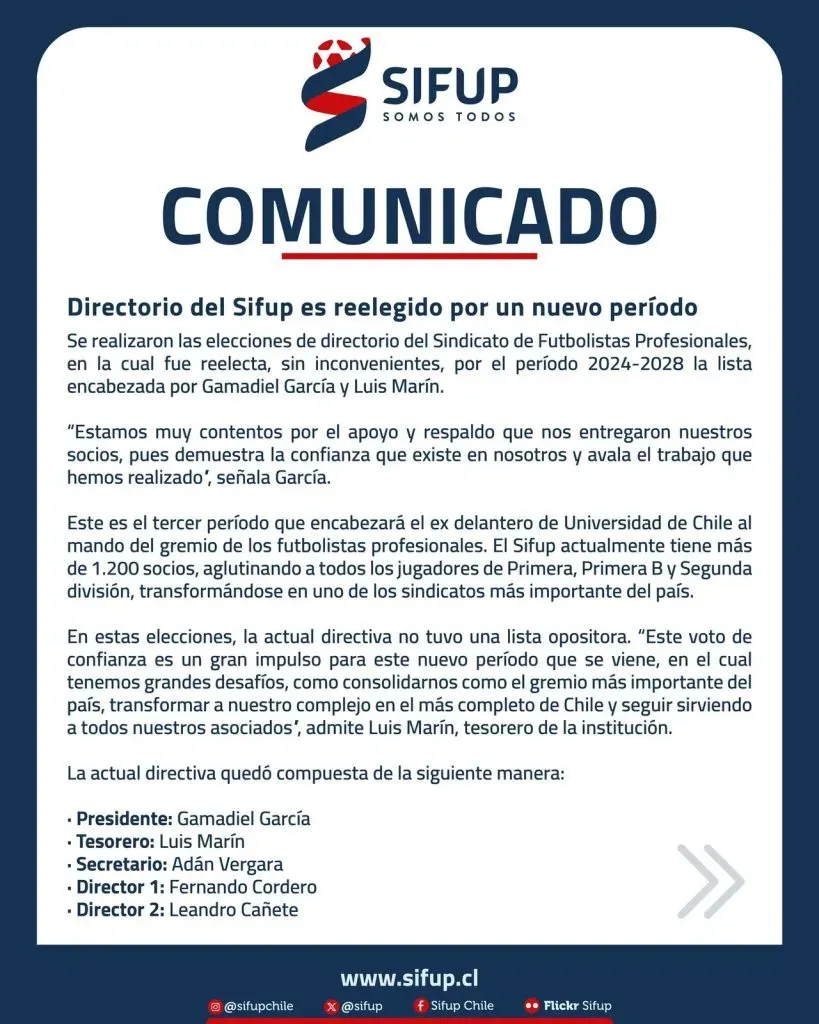 Para este nuevo período al mando del Sifup, Gamadiel García tendrá en su directiva a Luis Marín como tesorero, al ex defensor Adán Vergara como secretario, además del arquero Leandro Cañete y el lateral Fernando Cordero como directores.