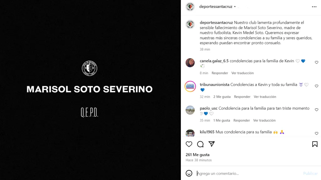 “Nuestro club lamenta profundamente el sensible fallecimiento de Marisol Soto Severino, madre de nuestro futbolista, Kevin Medel Soto. Queremos expresar nuestras más sinceras condolencias a su familia y seres queridos, esperando puedan encontrar pronto consuelo”, publicó Santa Cruz.