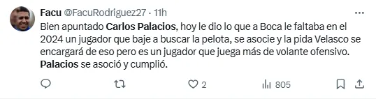 Más allá del buen sabor que dejó en la prensa trasandina, la actuación de Palacios en su debut con Boca generó ilusiones entre los hinchas del xeneize. Pese a los pocos minutos de acción, el chileno ya comienza a ganarse el corazón de los más fanáticos.