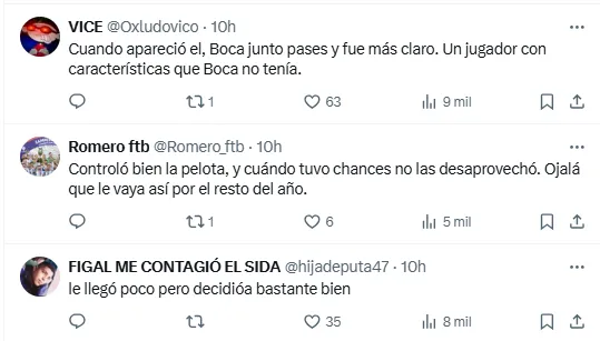 Así quedó demostrado en Twitter, donde su nombre se hizo rápidamente TT al otro lado de la cordillera con varios comentarios alabando su rendimiento. Son varios los que lo quieren ver triunfar con la camiseta de Boca.