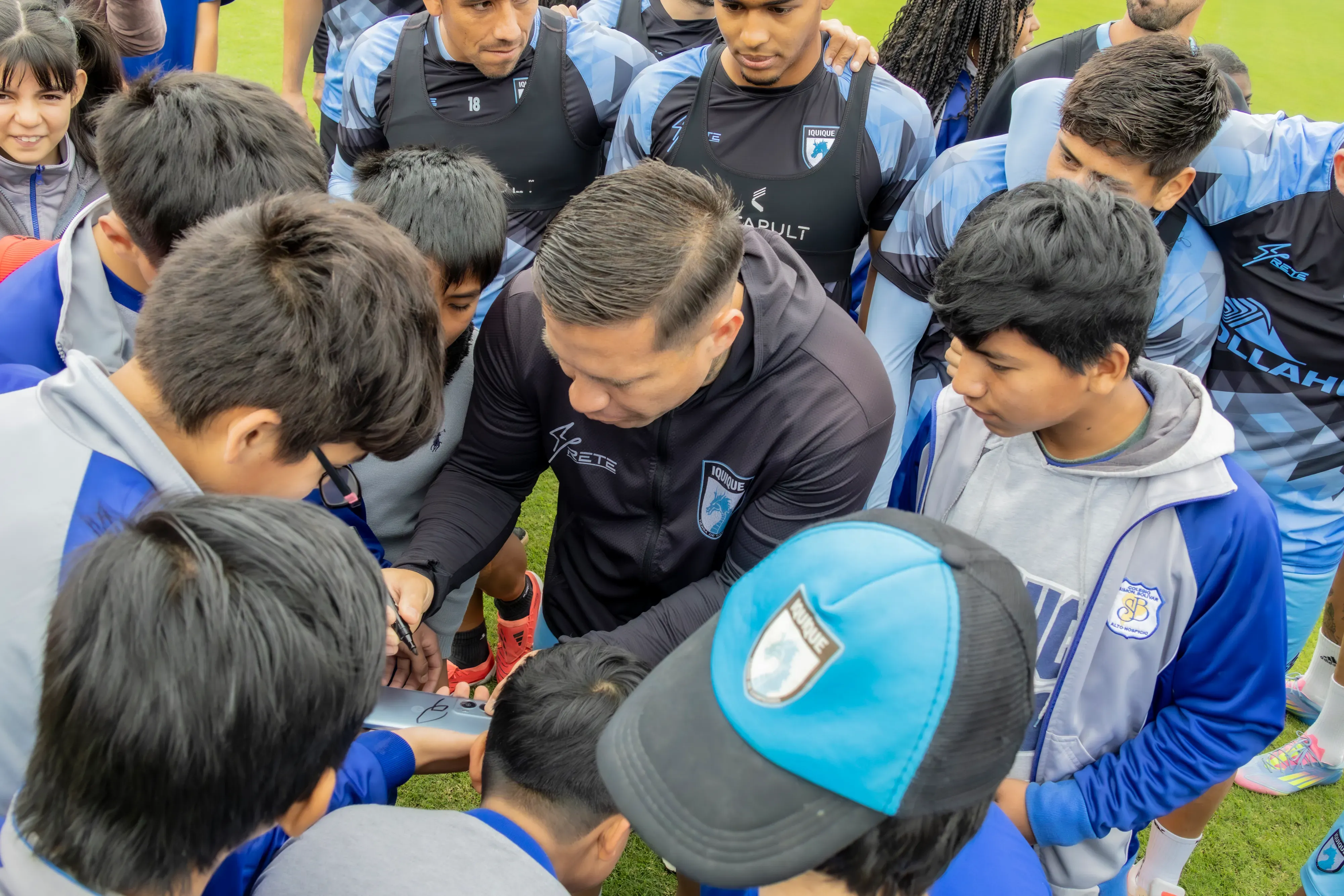 En el Estadio Tierra de Campeones se firmó el convenio que busca promover la actividad física, mejorar la asistencia escolar y fortalecer el vínculo entre estudiantes y su entorno. Ahí, figuras como Edson Puch y Álvaro Ramos se llenaron del apoyo de estudiantes.