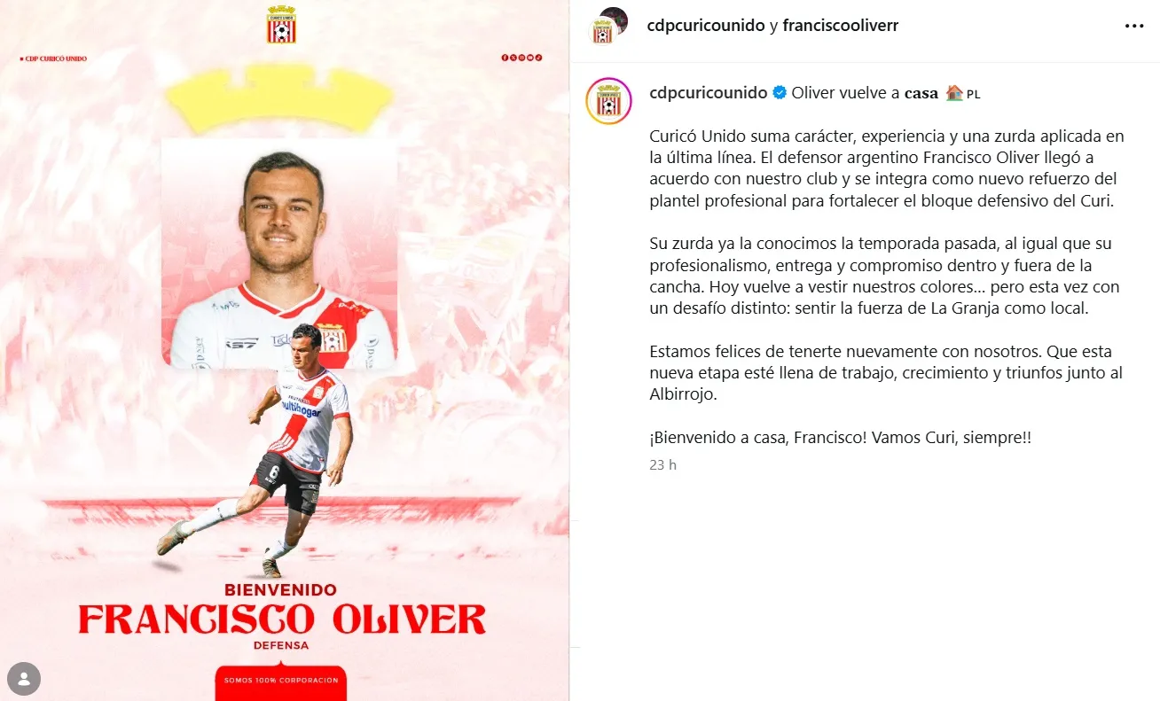 A través de sus redes, el equipo de Damián Muñoz anunció su regreso. “Curicó Unido suma carácter, experiencia y una zurda aplicada en la última línea. El defensor argentino Francisco Oliver llegó a acuerdo con nuestro club y se integra como nuevo refuerzo del plantel profesional para fortalecer el bloque defensivo del Curi”