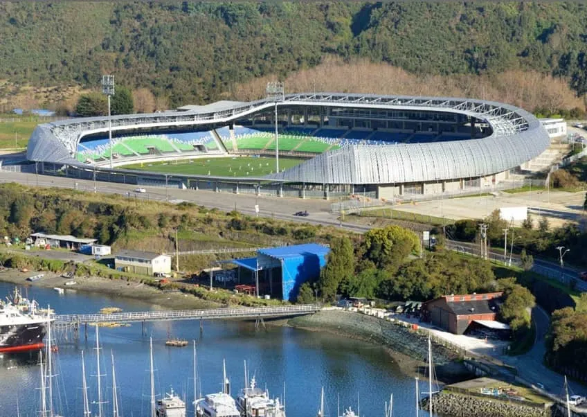 “La impresionante arquitectura de este recinto contrasta con el puerto de la ciudad y el Océano Pacífico”, reza el lema junto a la fotografía del estadio más austral del mundo.
