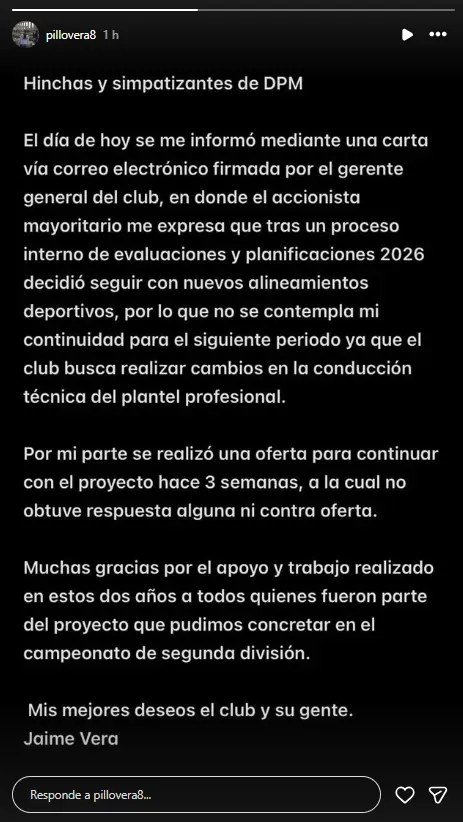 “El día de hoy se me informó mediante una carta vía correo electrónico firmada por el gerente general del club, en donde el accionista mayoritario me expresa que tras un proceso interno de evaluaciones y planificaciones 2026 decidió seguir con nuevos alineamientos deportivos, por lo que no se contempla mi continuidad para el siguiente periodo ya que el club busca realizar cambios en la conducción técnica del plantel profesional”.