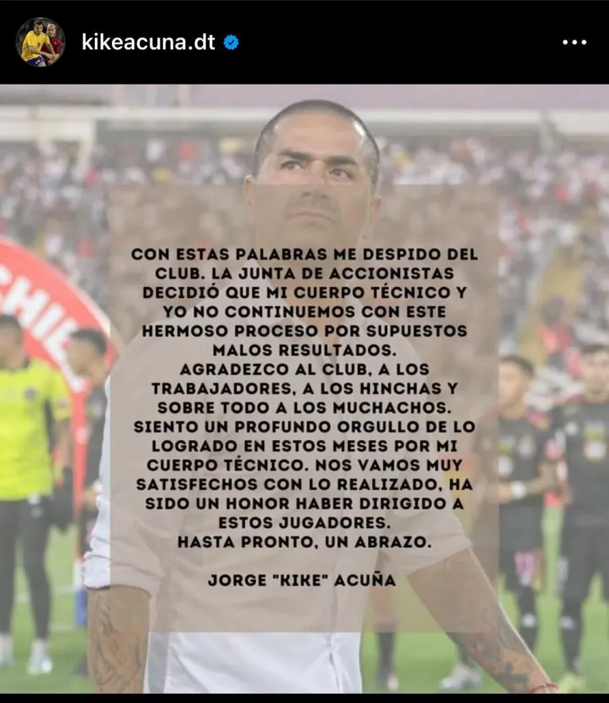 Conocido el comunicado, llegó el momento en que Acuña diera su versión de los hechos, lo que lo hizo en su Instagram, donde lanzó un dardo a la dirigencia de Santiago City.