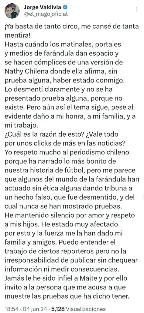 “¡Ya basta de tanto circo, me cansé de tanta mentira!”, comenzó su escrito el Mago, quien le reprochó a los “matinales, portales y medios de farándula” hacerse “cómplices de una versión (…) sin prueba alguna”.
