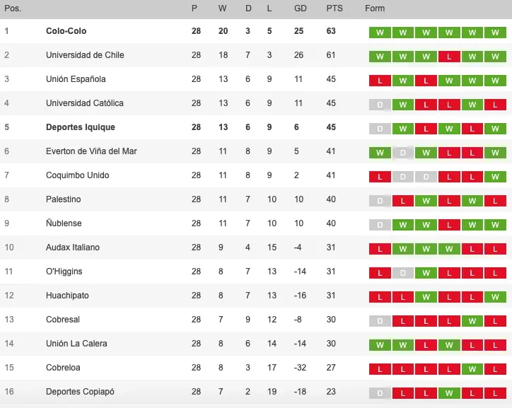 Mira la tabla de posiciones del Campeonato Nacional 2024