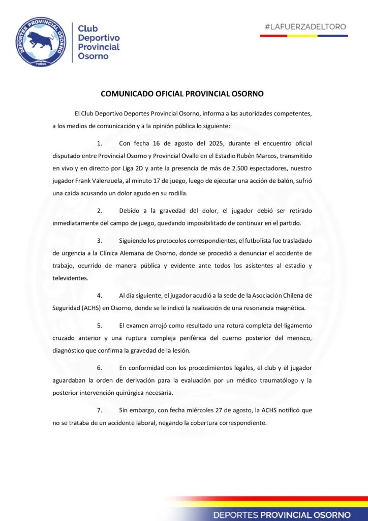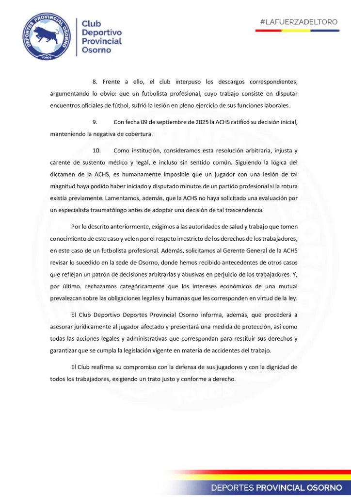 Fue Provincial Osorno, quien a través de un comunicado de prensa colgado en redes sociales que denunció a la Asociación Chilena de Seguridad (ACHS) de negar la cobertura por accidente laboral a uno de sus jugadores.