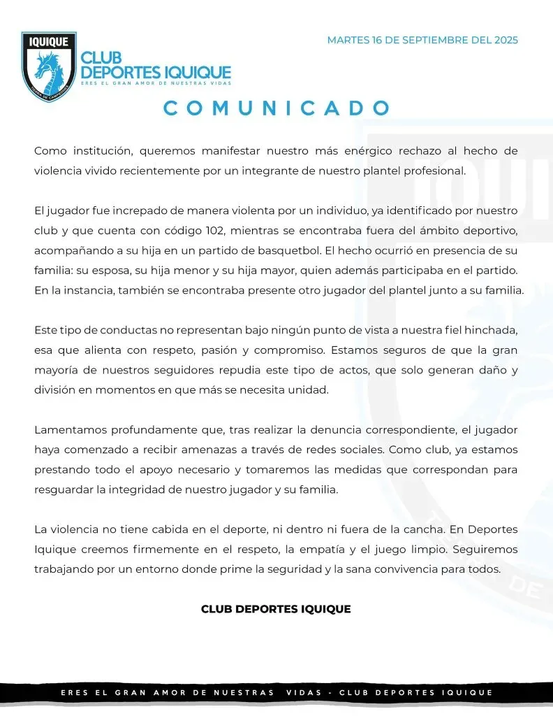 Con ello, el cuadro del norte también anuncian que prestarán “todo el apoyo necesario y tomaremos las medidas que correspondan para resguardar la integridad de nuestro jugador y su familia”.