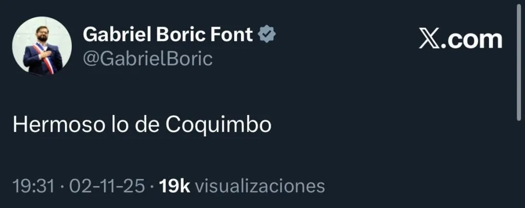 Fue en su cuenta oficial de la red social “X” donde el Presidente Gabriel Boric reaccionó sobre el título de Coquimbo Unido, con un mensaje para sus hinchas que celebraron.
