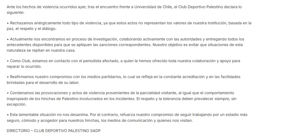 Fue en las plataformas digitales de Palestino, donde se dio a conocer la respuesta del club: “Rechazamos enérgicamente todo tipo de violencia, ya que estos actos no representan los valores de nuestra institución, basada en la paz, el respeto y el diálogo”.