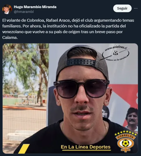 “El volante de Cobreloa, Rafael Arace, dejó el club argumentando temas familiares“, detalló el periodista Hugo Marambio Miranda en su cuenta de X (anteriormente conocida como Twitter), provocando un problema no menor para el cuadro minero.