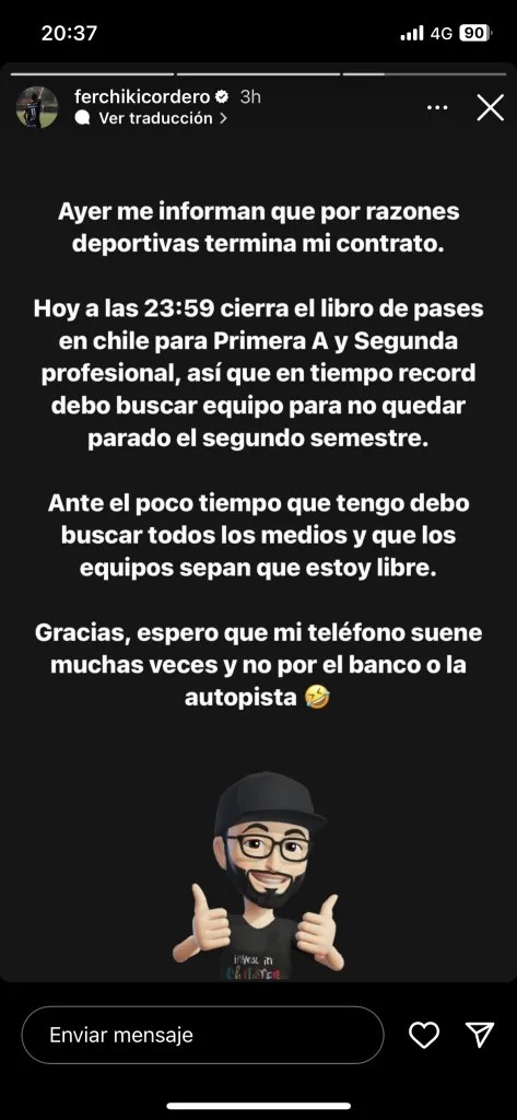 “Hoy a las 23:59 cierra el libro de pases en Chile, para la Primera A y la Segunda Profesional, así que en tiempo récord debo buscar equipo para no quedar parado en el segundo semestre”, relató.