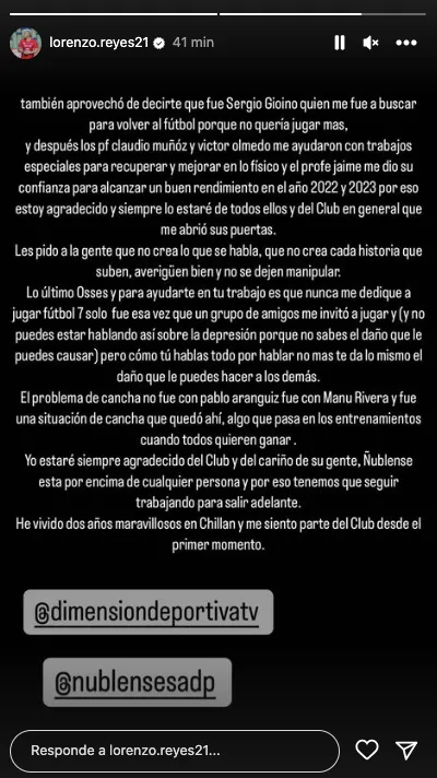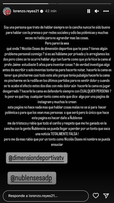 Uno de los jugadores involucrados en esa pelea, Lorenzo Reyes, salió al paso de especulaciones que hablaban de una supuesta cama hacia García. Con nombre y apellido, mediante su Instagram, el ex Universidad de Chile habló fuerte y claro sobre esas acusaciones.