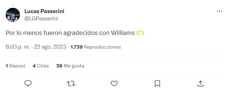 Ante el posteo de Unión La Calera en Twitter, Passerini responde “por lo menos fueron agradecidos con Williams“, generando revuelo en las redes sociales y los hinchas cementeros.