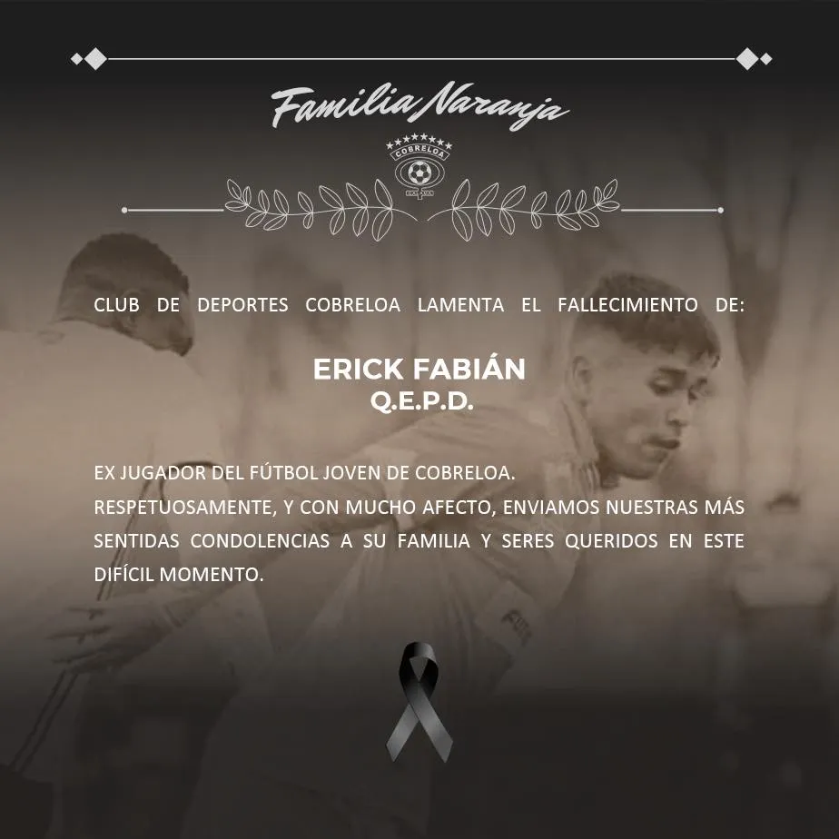Cobreloa publicó un emotivo mensaje en memoria de Erick Fabián, futbolista de 28 años fallecido y que perteneció a las fuerzas del club loíno. Los naranjas están de luto y se llenaron de apoyo por la partida de uno que fue figura.