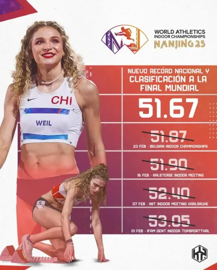 Martina Weil logró este viernes clasificar a la final de los 400 metros en los Mundiales de pista cubierta de Nanjing, China. Con un tiempo de 51.67 segundos, rompió el récord nacional de la distancia bajo techo, superando su propio récord anterior de 51.87, que había logrado en Gante, Bélgica, hace menos de un mes.