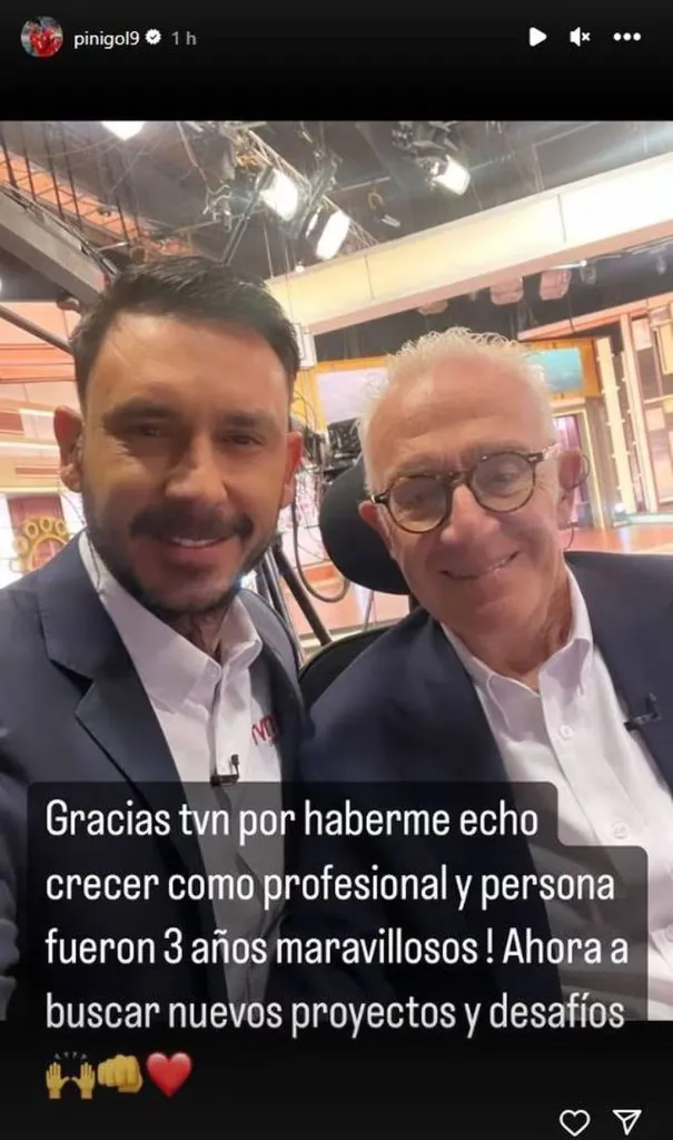 En las últimas horas, Pinigol compartió una imagen en sus historias de Instagram donde salía junto a Pedro Carcuro. Allí le dijo adiós al área deportiva de TVN, canal donde además de comentar múltiples eventos y brillar en los Juegos Panamericanos Santiago 2023, también condujo varios programas.